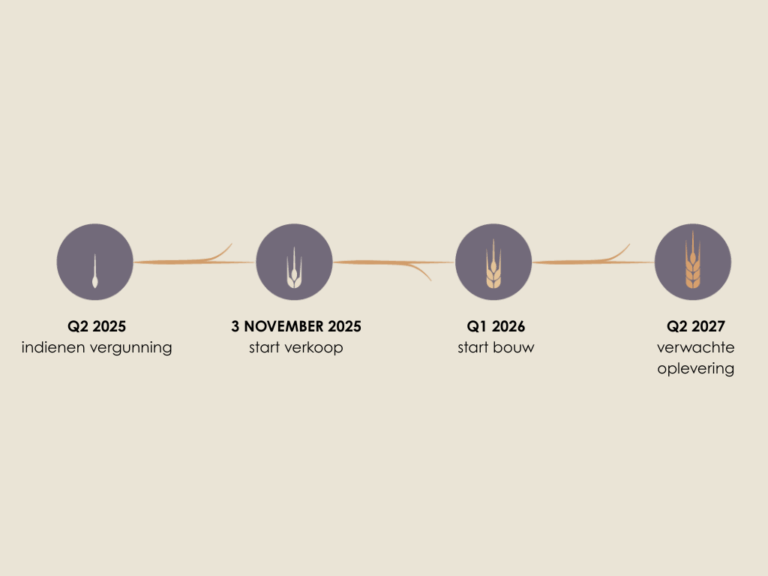 In Q2 van dit jaar is de vergunning ingediend. De verkoop gaat op 3 november van start. Om op de hoogte te blijven van de laatste ontwikkelingen kun je je aanmelden via onze website. We vullen de informatie regelmatig aan, zodat je steeds meer te weten komt over het project.